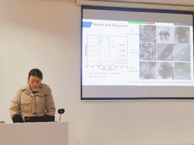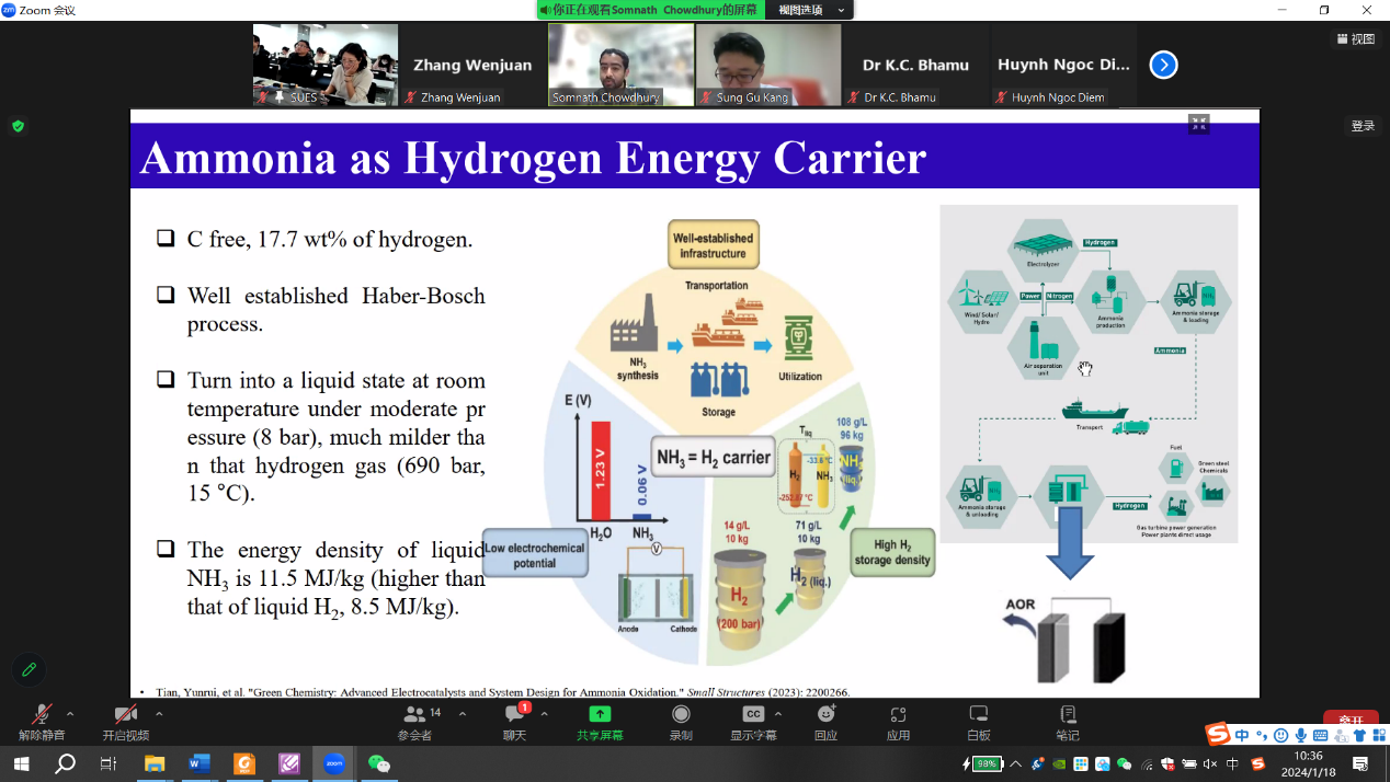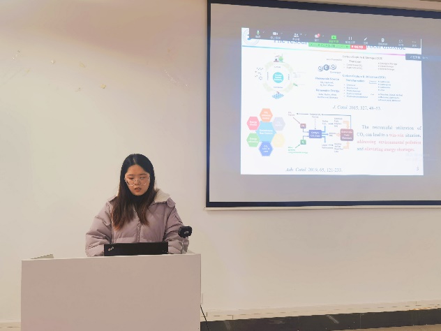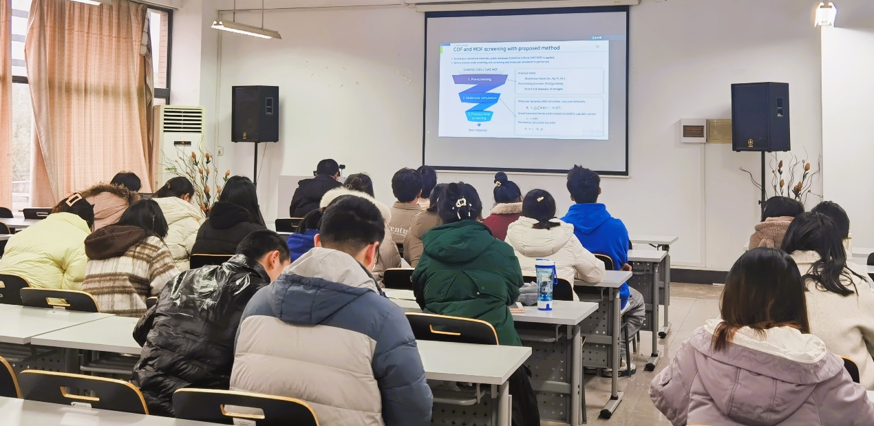 首先是韩国蔚山大学的Seongbin Ga教授作了题为“Machine Learning-based Guidelines for Material Selection in Membrane Process”的专题报告,博士后Tran Van Tam、K. S. S. V. Prasad Reddy和Hamidreza Soltani Panah分别就各自的研究领域进行了分享,并分别进行了题为“Scalable fabrication of NP-doped graphene quantum dots/ graphene aerogel composites as trifunctional electrocatalysts for free-binder and free-metal Zn−air batteries and overall water splitting”、“First-Principles Elucidation of Ammonia Oxidation Reaction Mechanism on Ptn/CeO2 catalysts”和“Binodal and Spinodal Curves of Ternary Systems Containing Lignin Using the NRTL and UNIQUAC Models”的学术分享。中韩双方参会的研究生们也积极汇报了在各自的研究领域取得的研究成果。期间,与会教师、员工就报告内容进行相应的提问,深入探讨双方目前研究方向的共同性与差异性,踊跃交流各自项目的研究原理、研究方法及研究过程中问题的解决等。