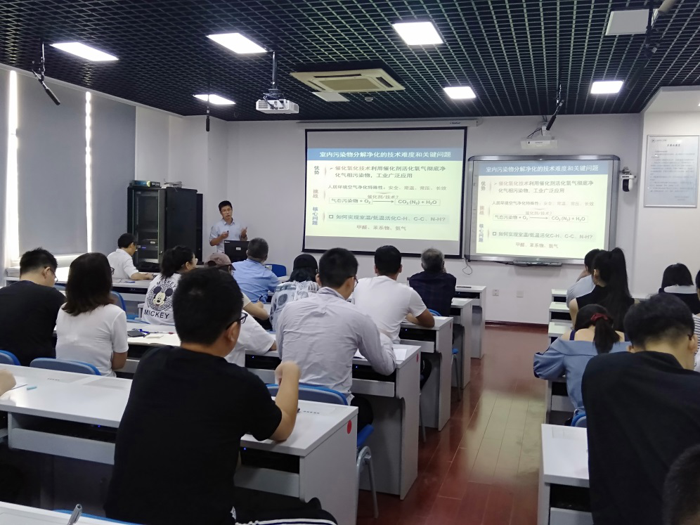 张长斌研究员从大众关心的室内环境VOCs开始,介绍了他在环境催化、大气污染控制领域的系列研究成果。从探究低温常温条件下甲醛处理,到氨气和苯系物的净化;从贵金属的选择,到碱金属共掺杂提高贵金属分散度,再到载体表面羟基种类对催化净化VOCs的机理,结合多样的表征手段,张长斌研究员都做出了详细的介绍。除此之外,其研究成果与企业对接,获得的相关专利能够应用于室内空气VOCs治理,科研成果的及时转化,产生了很大的经济效益。报告会后,公司师生就关心的话题与张长斌研究员进行了积极互动,现场气氛热烈。
