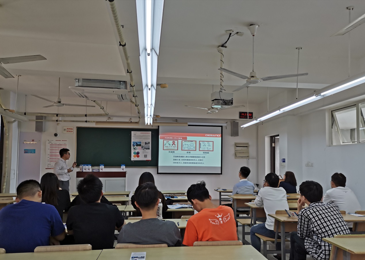 在宣讲会中,主讲人从企业概述、企业文化、校招岗位及流程等方面向我们展现了公司的实力与人才需求。迪赛诺专注于抗艾滋病药剂的研制,获得多个国家级奖项,其原料占全球非专利药市场的33%,为全球最大的抗艾滋病药物原料供应商;抗艾滋病药物制剂超过国内市场的50%,为国内主要抗艾滋病药物制剂供应商。该公司始终致力于人类健康事业的使命,助艾滋病从原本无力回天的绝症逐渐转变为慢性病。