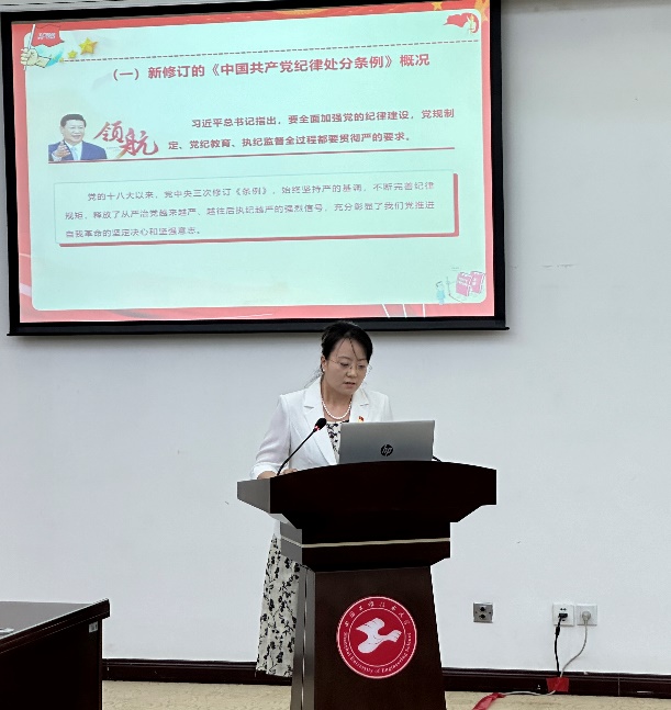 杨娟教授做“加强党性严守工作纪律”专题辅导,从新修订的《中国共产党纪律处分条例》概况、关于工作纪律条例重点内容的学习解读、关于工作纪律条例重点案例的解析警示、深刻认识关于工作纪律条例的重要意义四个方面解读党的工作纪律要求,用身边的重点案例做解析,提醒党员干部保持常态党纪学习,做到 “咯噔”多一下,“戒尺”长一寸,“堤坝”高一分。