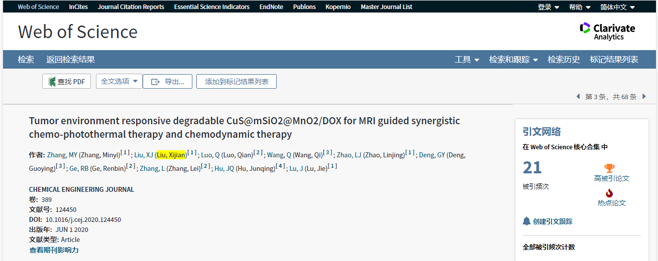 近日,公司太阳成集团tyc151cc药物分析与高效化研究团队的刘锡建副教授、陆杰教授指导研究生在化学工程领域著名学术期刊《Chemical Engineering Journal》发表的学术论文“Tumor environment responsive degradable CuS@mSiO2@MnO2/DOX for MRI guided synergistic chemo-photothermal therapy and chemodynamic therapy”,同时入选新一期的ESI高被引和热点论文,期刊最新影响因子为10.65。论文的被引用次数为其工程领域最优秀的前0.1%,说明该科研成果得到同行认可。