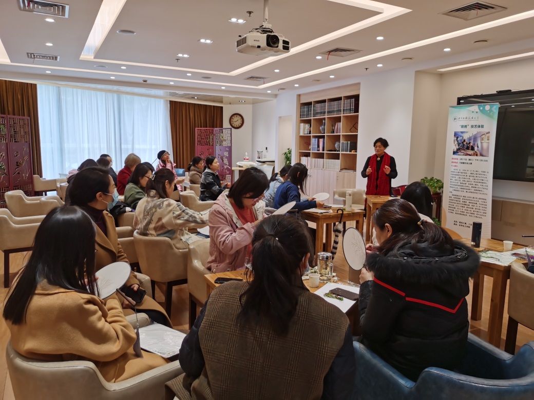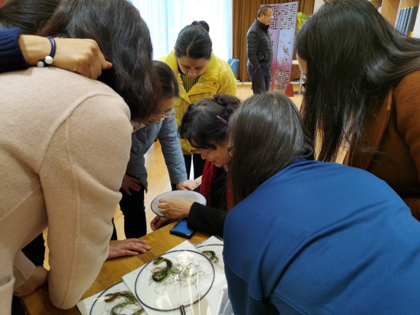 钱月芳大师讲解了“顾绣”的发展和传承历史,她认为“顾绣”对锻炼心智,陶冶情操很有益处,尤其有助于脑力工作者调整情绪,思考问题。她耐心讲解了“顾绣”技巧和运针方法,并现场指导女教师们用“顾绣”技艺绣扇面。现场的女教师表现出了对“顾绣”技艺的浓厚兴趣,在钱老师的指导下,她们细心琢磨,互相讨论,穿针引线,描龙绣凤,一幅幅栩栩如生的扇面呈现出来。