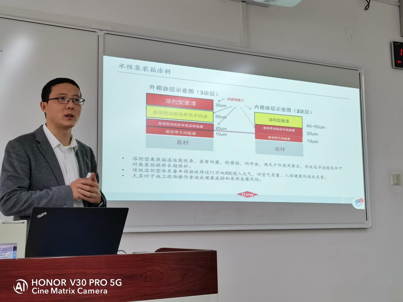 为了开拓员工的视野,接触世界前沿技术,提升理论好实践相结合的能力,2021年3月19日下午,国内著名涂料专家,陶氏化学工业涂料技术服务和开发技术经理束树军博士应邀来校,在教学楼E307给公司涂料工程专业全体师生作了《水性工业涂料的应用及技术进展》的专题讲座,讲座由高分子材料与工程系副系主任陈凯敏主持。
