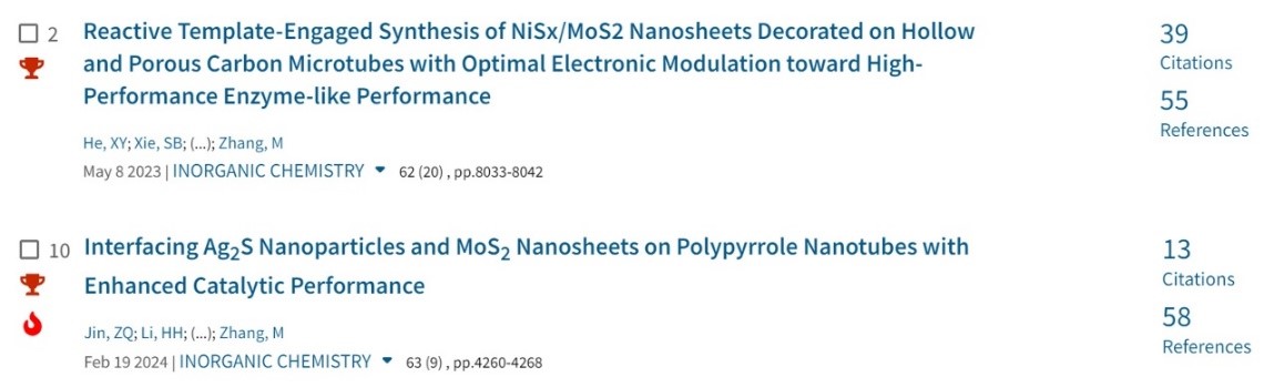 太阳成集团tyc151cc张敏教授课题组长期从事镍基和二硫化钼基纳米复合材料的设计、组装及应用。2019年以来,课题组围绕“基于管状二硫化钼功能化纳米复合材料的合成及构效”研究开展了一系列工作,发展了一步牺牲模板法制备二硫化钼管状复合纳米材料共聚技术,并将其应用于类酶催化、生物传感和高级氧化及脱盐等领域。其中,在国际著名期刊Inorganic Chemistry(IF 4.3,二区,自然指数期刊)发表的论文,受到广泛关注,成功入选新一期的ESI前1%及热点论文。