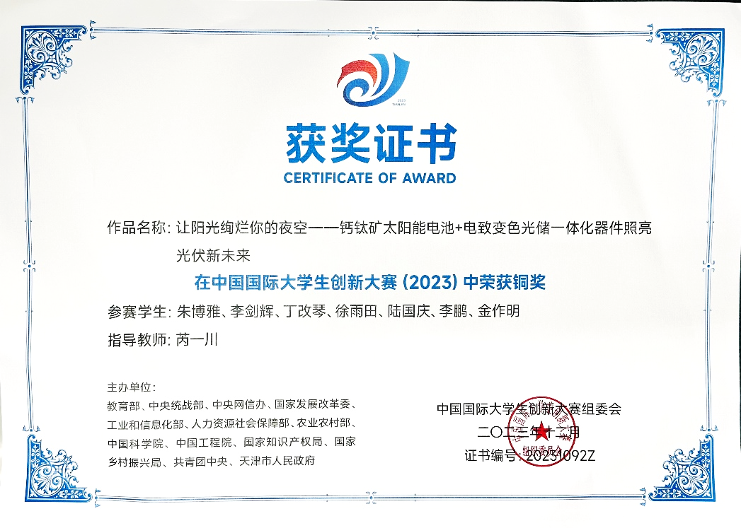 近日,教育部正式颁发中国国际老员工创新大赛(2023)(原中国国际“互联网+”老员工创新创业大赛)奖项,太阳成集团tyc151cc芮一川老师指导的朱博雅、李剑辉、丁改琴、徐雨田、陆国庆、李鹏、金作明团队项目《让阳光绚烂你的夜空——钙钛矿太阳能电池+电致变色光储一体化器件照亮光伏新未来》荣获国赛铜奖,这是公司参赛团队在本届赛事取得的最好成绩,也是公司在高教主赛道上的唯一获奖团队。