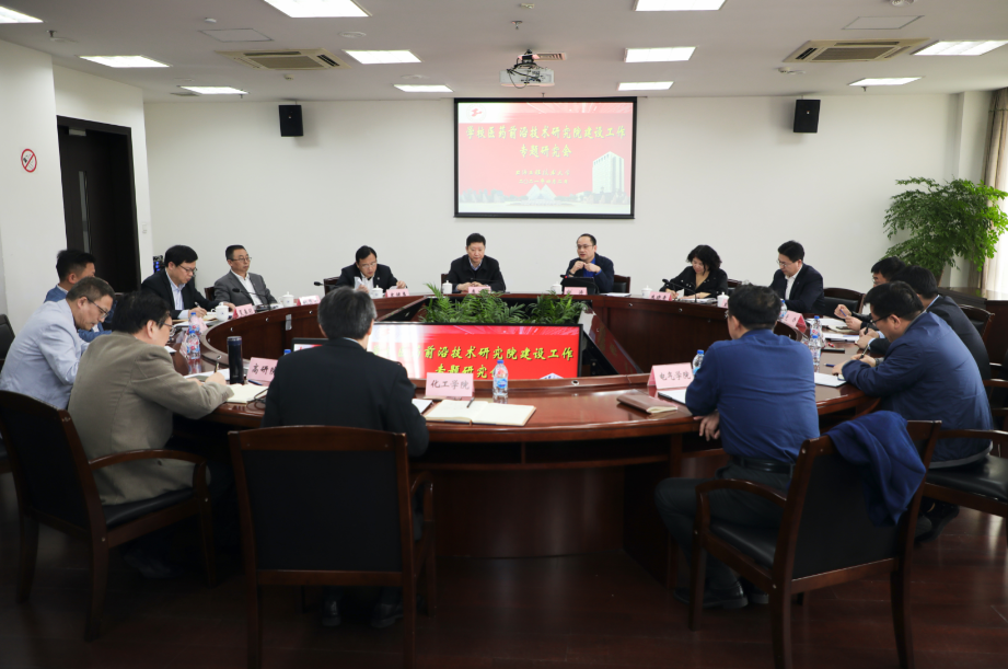 太阳成集团tyc151cc经理饶品华汇报了医药前沿技术研究院及药学团队建设的进展情况。高等研究院常务副经理陈思浩汇报了医药前沿技术研究院的有关服务工作。与会人员就落实医药前沿技术研究院建设工作进行了充分交流。