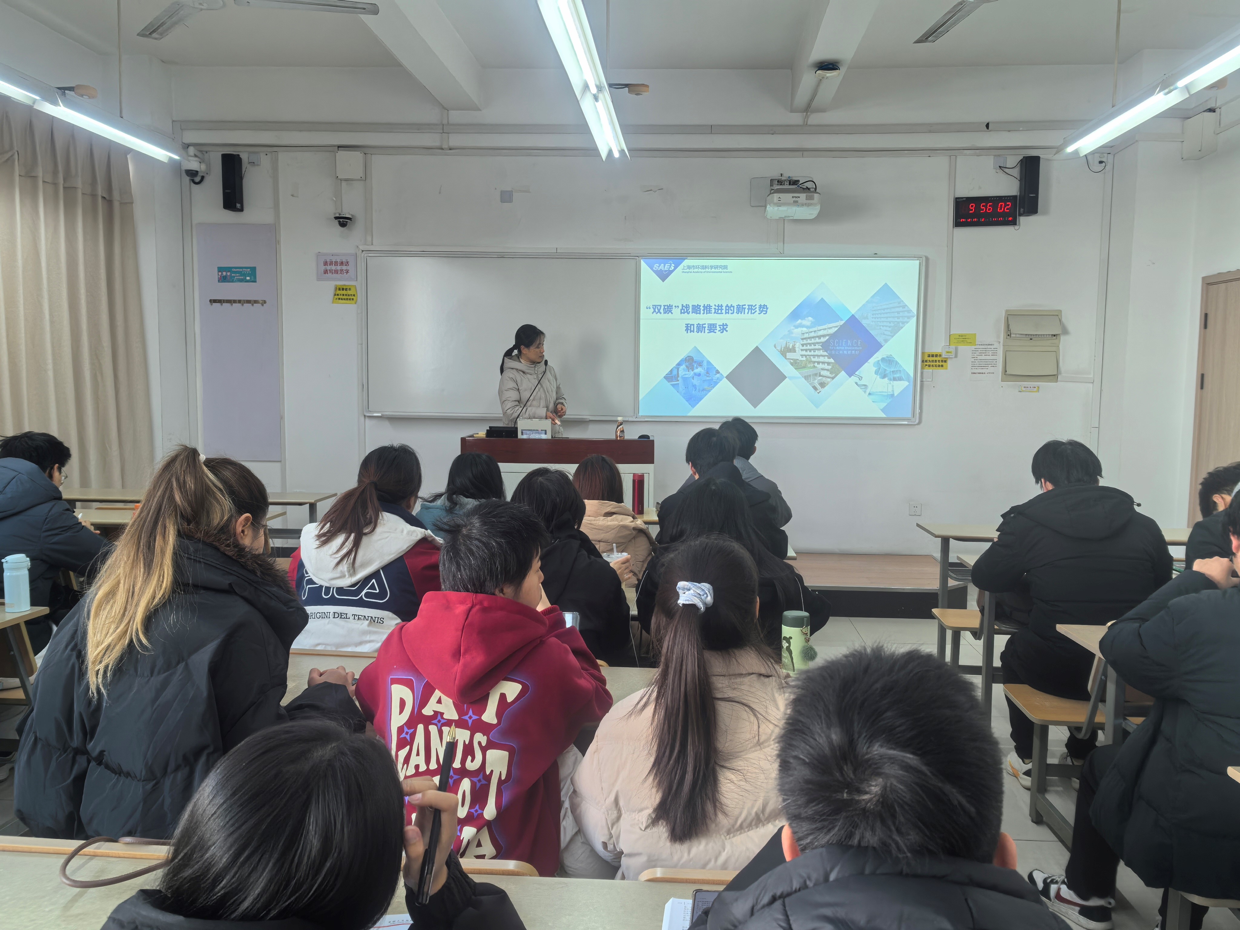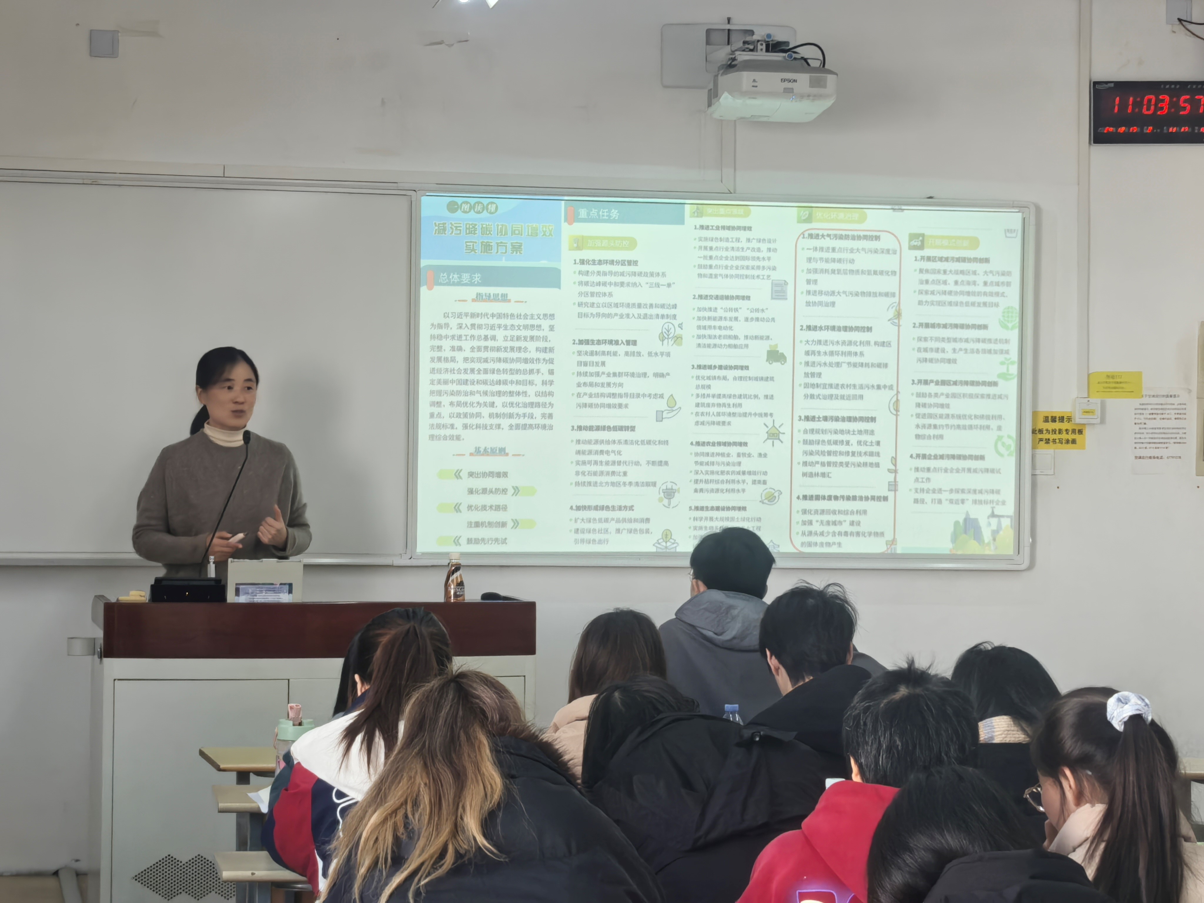 胡静主任结合自身多年的实践经验,向在场的师生们详细讲解了双碳战略推动下的新形势和新要求,并分享了关于环境政策与可持续发展方面的前沿研究成果。她特别指出,尽管全球环境正朝着稳中向好的方向发展,但每一位环境工程专业的员工都肩负着应对未来环境挑战的时代重任。