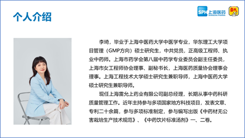 李琦老师从“习近平总书记关于加快推进中医药现代化、产业化的重要指示”和“上海3+6新型产业体系”切入,为同学们解读了中药传承精华、守正创新的重要意义。上海雷允上药业有限公司是世界500强上海医药集团旗下的中成药核心企业,汇聚以“上海中药四大户”为核心的上海百年中药制造工业精华。李老师动情讲述了公司在创新发展中创造的多项“中国第一”,如第一张橡胶制硬膏剂、第一支中药注射剂、第一包颗粒剂、第一个真菌类药物、第一粒滴丸、第一个中西复合制剂、第一张中药巴布膏剂等,以及国家保密品种、国家级非物质文化遗产中成药六神丸、国内唯一具有原国家二类新药证书和产品批文的银杏叶提取物原料药银杏酮酯等。