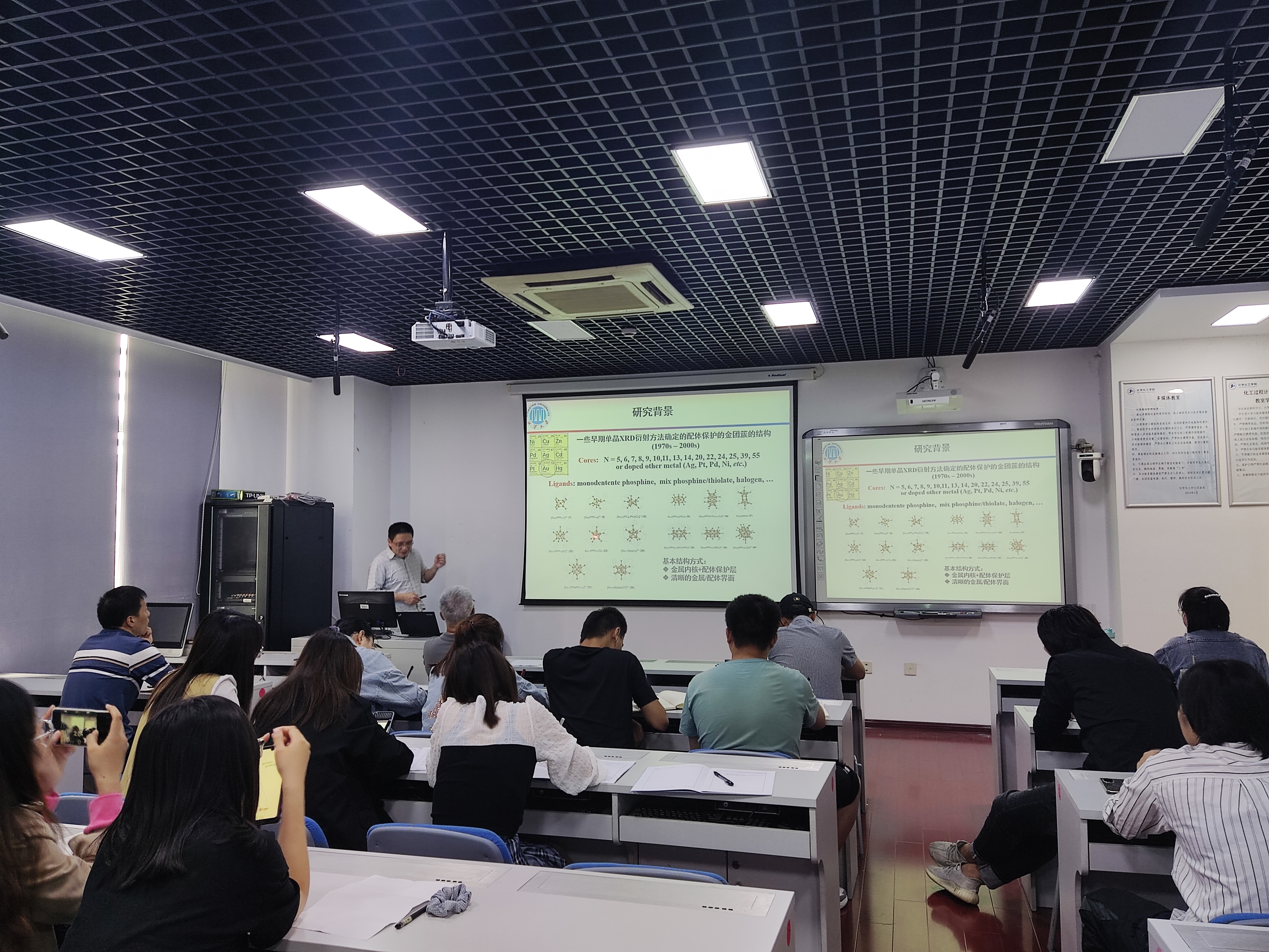 裴勇教授针对近年来在配体保护的贵金属纳米团簇,特别是硫醇配体保护的金纳米团簇的结构和物性的理论计算模拟研究工作作学术报告。首先对近年来国际上在金纳米团簇研究领域取得的研究进展进行介绍。随后针对团簇的结构理论、团簇的电子结构理论和团簇的金属交换反应机制三方面,裴教授分别介绍了课题组研究总结提出的金团簇的基本结构特性和结构规律性,在研究金纳米团簇的电子结构方面取得的主要成果,及近期关于此类团簇的自发金属交换机制的初步成果。从理解团簇结构的角度,提出了一种新的观点阐述团簇的价电子结构,理论揭示了配体保护金、银团簇金属交换的可能机制。最后列举了部分配体保护金纳米团簇研究中仍待解决的问题,包括团簇的形成机制、配体保护的银团簇的结构演化方式及电子结构规则等有待进一步探索。报告结束后,裴勇教授回答了老师和同学们的提问并进行了积极的交流与讨论。
