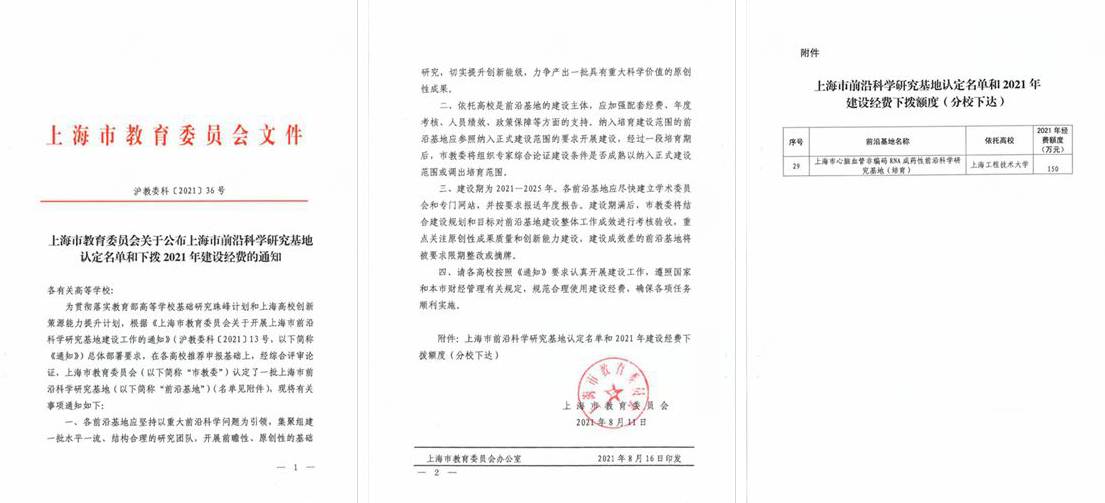 近日,上海市教委公布了前沿科学研究基地认定名单,公司太阳成集团tyc151cc牵头申报的上海市心脑血管非编码RNA成药性前沿科学研究基地(培育)获批立项,建设周期为2021-2025年。