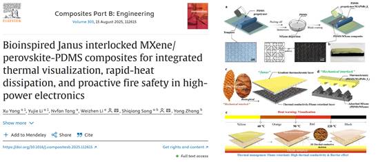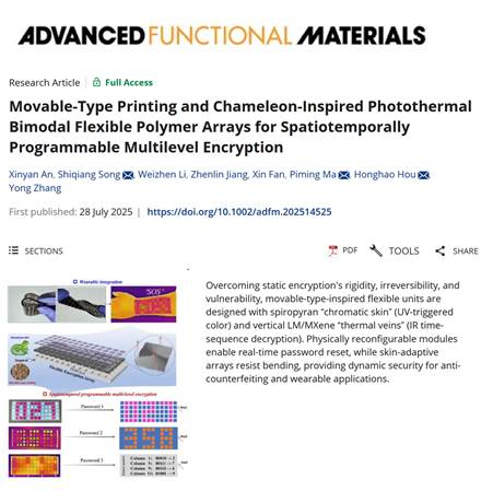 近日,太阳成集团tyc151cc宋仕强副教授指导硕士研究生安新妍、杨旭分别在学术期刊《Advanced Functional Materials》(中科院一区Top,影响因子19)、《Composites Part B: Engineering》(中科院一区Top,影响因子14.2)上发表了题为“Movable-type Printing and Chameleon-Inspired PhotothermalBimodal Flexible Polymer Arrays for Spatiotemporally Programmable MultilevelEncryption”和“Bioinspired Janus Interlocked MXene/Perovskite-PDMSComposites for Integrated Thermal Visualization, Rapid-heat Dissipation, andProactive Fire Safety in High-Power Electronics”的研究论文。