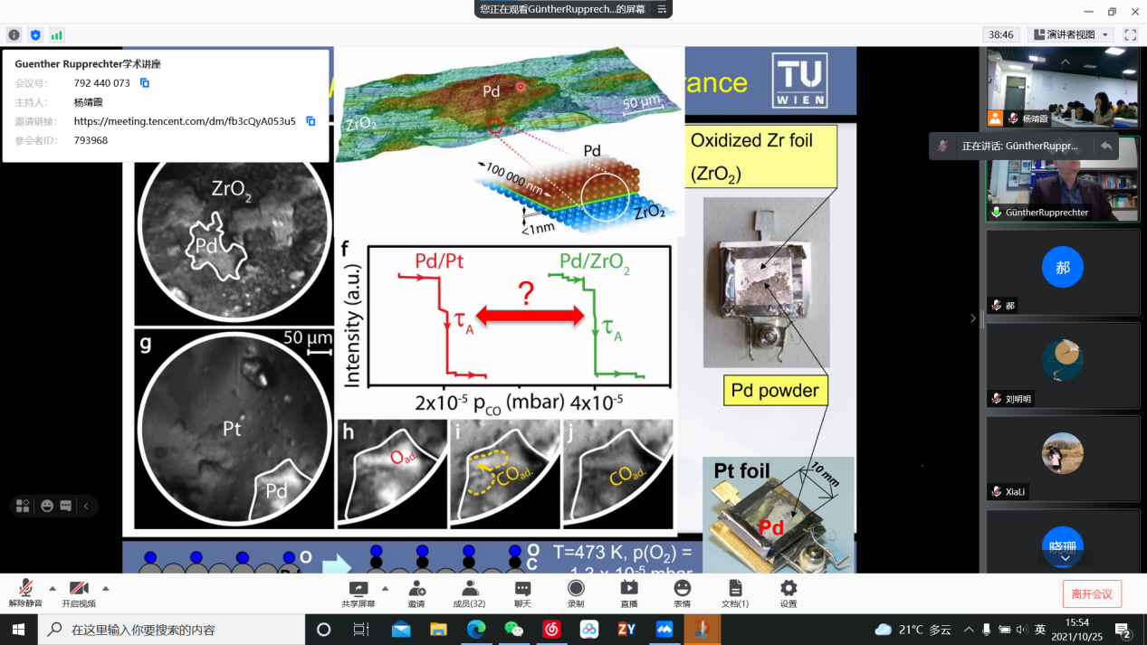 20211025日下午,世界著名多相催化专家,奥地利科公司院士Günther Rupprechter作为海外名师应邀,通过腾讯会议(会议号:792 440 073)为公司研究催化反应领域的全体师生作了《Watching ongoing reactions by single particle catalysis》的专题讲座。