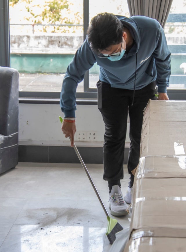 志愿者们来到了实训楼四楼后,老师对大家进行了工作分配。志愿者们分别拿起扫帚、抹布、拖把等各种工具,开始了清扫工作。每一位志愿者都不怕脏、不怕累,认真积极地完成各自的任务。大家齐心协力,最后顺利且圆满地完成了此次清扫工作。