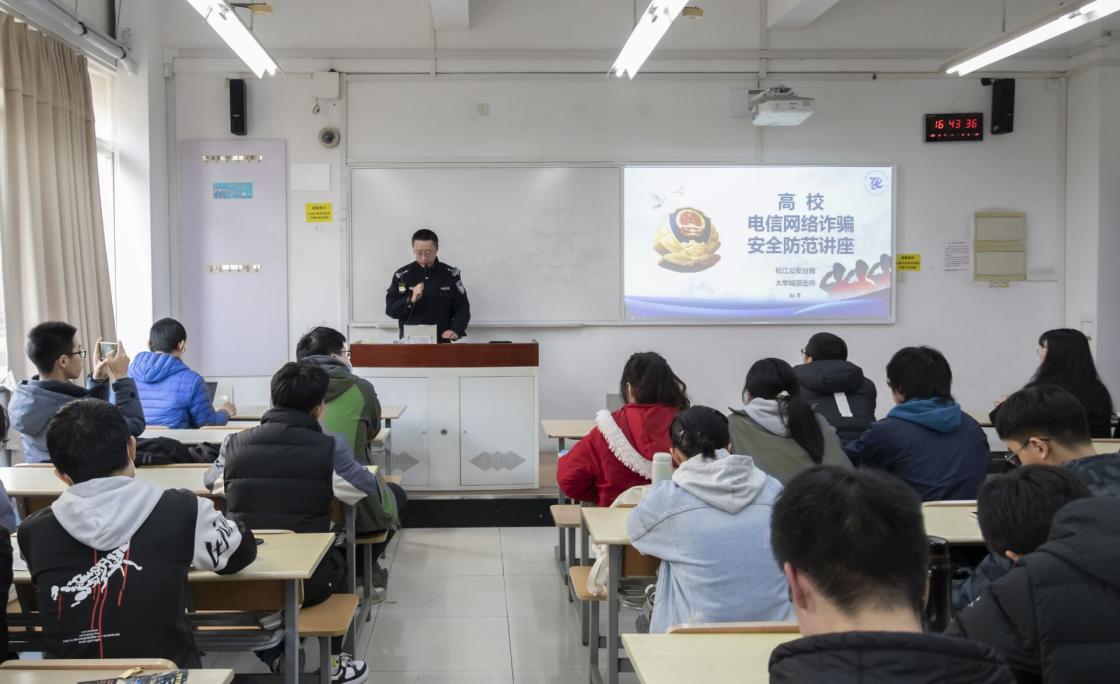 在简短的自我介绍后,钮警官从刷单,冒充客服,网聊诈骗三种骗术出发,以校园中易发生的各“冒充QQ好友”诈骗、“网络刷单返利”诈骗等电信网络诈骗真实典型案例,深入浅出地讲解了不法分子的惯用伎俩和手段,讲述受害人被骗的经过、分析发案原因,以及遇到该类情况的紧急应对方法。在讲座进行的过程中,同学们认真听讲,积极与钮警官互动交流。