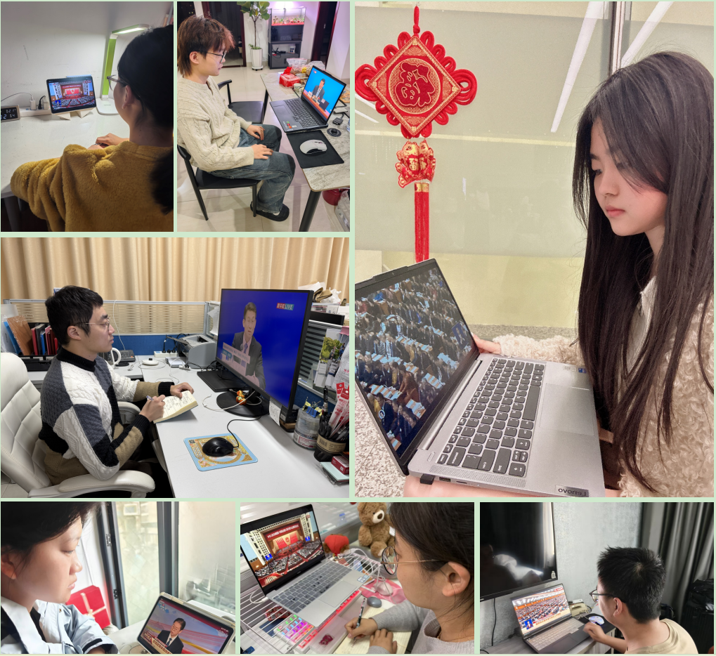 观看直播中,师生们认真聆听两会内容,重点关注科技创新发展、高校人才培养、青年就业创业等与公司发展、专业学习紧密相关的议题。高分子专业员工吴悠深受鼓舞,表示两会对绿色低碳的重点部署,让大家清晰认识到专业所学知识在绿色低碳、高端材料领域的重要价值,未来将深耕专业知识,钻研关键技术,主动对接国家战略需求。研究生万思佳在感悟中写道,要将个人理想融入国家发展,以实干担当书写青年答卷。辅导员王一凡学习后表示,将把两会精神融入日常思政教育与员工管理,坚守育人初心,厚植员工家国情怀,引导青年学子成长为堪当民族复兴重任的时代新人。