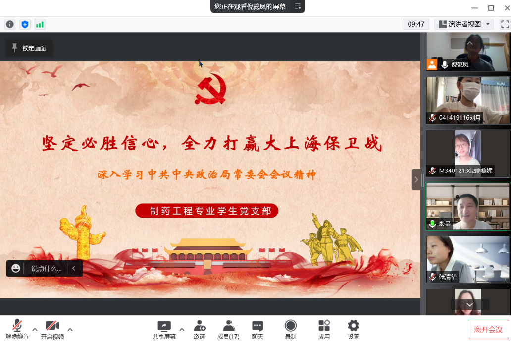 会上,宋勤健书记领学了习近平总书记主持召开中共中央政治局常务委员会会议时发表的重要讲话精神,传达了上海市委常委会扩大会议和市委、市政府坚决打赢大上海保卫战动员大会上关于新冠疫情防控的决策部署和工作要求。宋书记指出,在疫情防控的关键时期,习近平总书记的重要讲话对全国、上海市、公司公司的抗疫工作都是一个鞭策和鼓舞,为我们进一步统一思想,坚定信念,凝心聚力,打赢抗疫的大仗硬仗指明了方向,也注入了强大力量。我们要毫不动摇坚持“动态清零”的总方针,要把上级党组织和公司公司的疫情防控部署落实落细,党支部和党员师生要发挥好战斗堡垒和先锋模范作用,引导广大师生增强责任意识、自我防护意识,自觉承担防控责任和义务,筑牢群防群控防线。