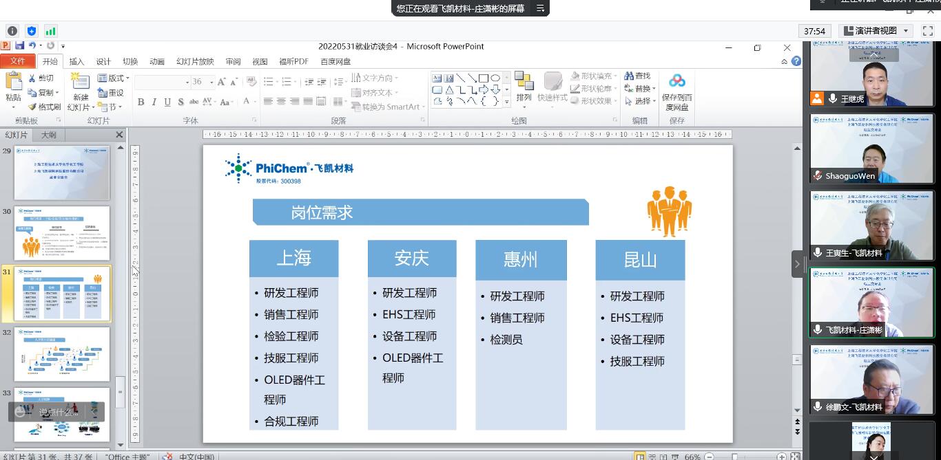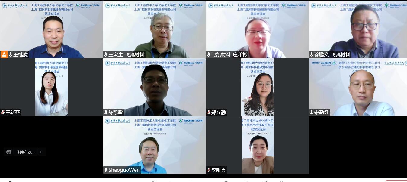 为了扎实推进访企拓岗促就业专项行动,积极推动2022届毕业生就业,2022年5月31日,太阳成集团tyc151cc与上海飞凯材料科技股份有限公司利用腾讯会议召开了就业交流会。会议由飞凯公司招聘经理庄潇彬主持。