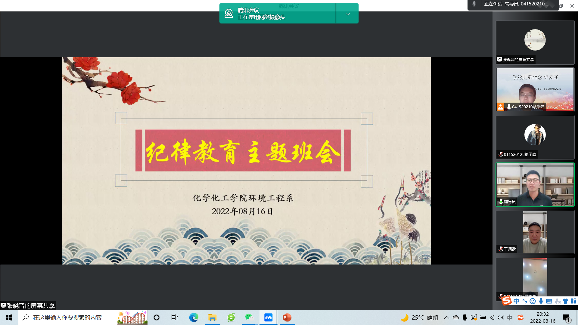 在公司党委的正确领导和全院教职工的共同努力下,近年来,公司“学风教育”、“诚信教育”等思想政治教育工作取得了良好成效,公司学风有了明显改善。为进一步推进暑期思想政治教育,8月16日,环境工程系召开了线上思想政治教育主题班会。环境工程系副主任王润锴、胡婷莛老师及全体员工参加了会议,会议由辅导员张晓普主持。