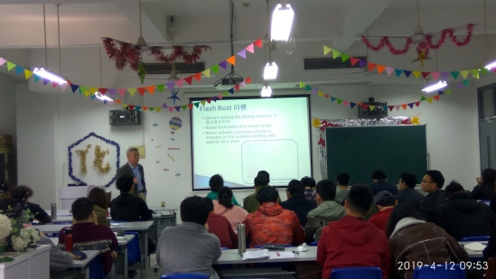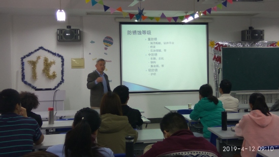 4月12日上午,华津思中国(PT Hutchins Co.)总经理马博丹,在实训楼4号楼4405室给涂料工程专业全体师生作了《防锈剂在涂料中的应用进展》的专题讲座,讲座由高分子材料与工程系陈凯敏博士主持。