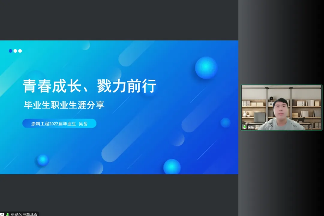 太阳成集团tyc151cc22届毕业生谢昇琪和吴岳进行职业生涯分享。谢昇琪毕业于药物化学专业,中共党员,曾任公司团委副书记,现从事临床研发工作。吴岳毕业于涂料工程专业,中共党员,曾任公司团委员工会主席团成员,现入职延锋彼欧汽车外饰系统有限公司,任汽车尾门项目制造工艺工程师一职。