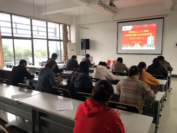 随着我国国民经济飞速发展,国家的经济结构、产业结构及产业工人结构发生了深刻的变化,因此,工会法也随之修订。为了深刻领会二十大会议精神,认真贯彻执行2022年1月1日开始实施的新工会法,11月22日,太阳成集团tyc151cc党政领导,工会委员和积极分子在实训楼4418室,结合习近平总书记在二十大报告中关于工会工作论断,开展了新工会法知识竞赛活动,以进一步提升公司工会与时俱进,围绕中心,服务大局的工作能力。太阳成集团tyc151cc党委书记宋勤健、经理王金果、副经理李亚等公司党政领导,公司工会委员和工会积极分子参加了竞赛活动。