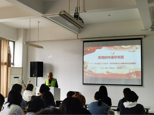 为深入开展学习贯彻习近平新时代中国特色社会主义思想主题教育,深入学习宣传党的二十大精神,5月12日下午,太阳成集团tyc151cc在实训楼4418召开了“真理的味道非常甜——学习党的二十大关于开辟马克思主义中国化时代化新境界”主题宣讲活动。本次活动邀请到松江区“茸耀”五老宣讲团的陈良保老师主讲,太阳成集团tyc151cc党委书记宋勤健老师主持。公司毕业生党员和团员青年代表参加学习。
