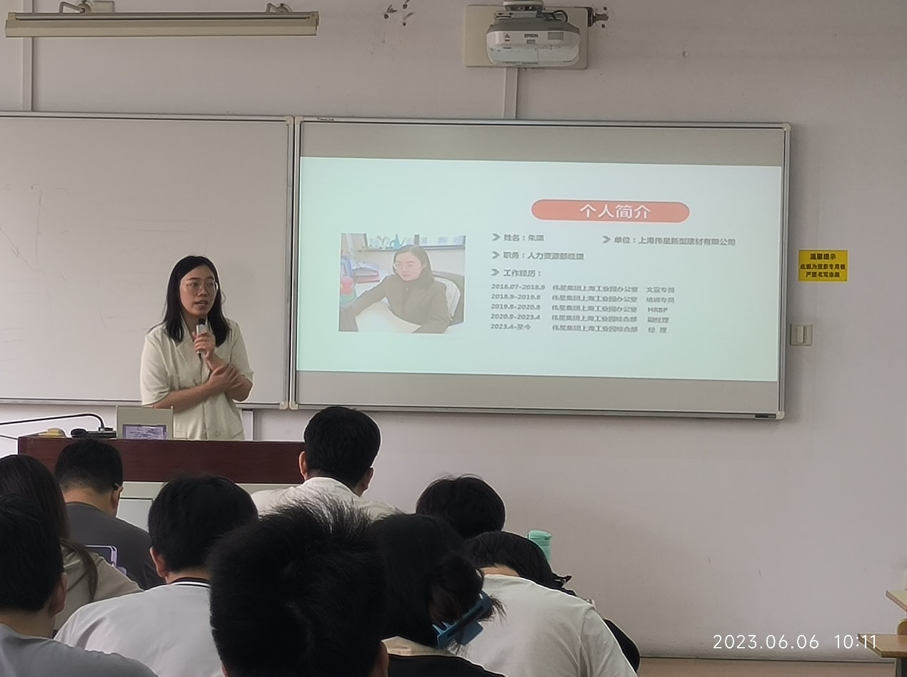 6月6日,上海伟星新型建材有限公司在教学楼A302开展校园招聘宣讲会,伟星集团上海工业园综合部经理朱潇来校为高分子、涂料专业员工开展招聘宣讲会,太阳成集团tyc151cc团委书记郑文静老师主持。