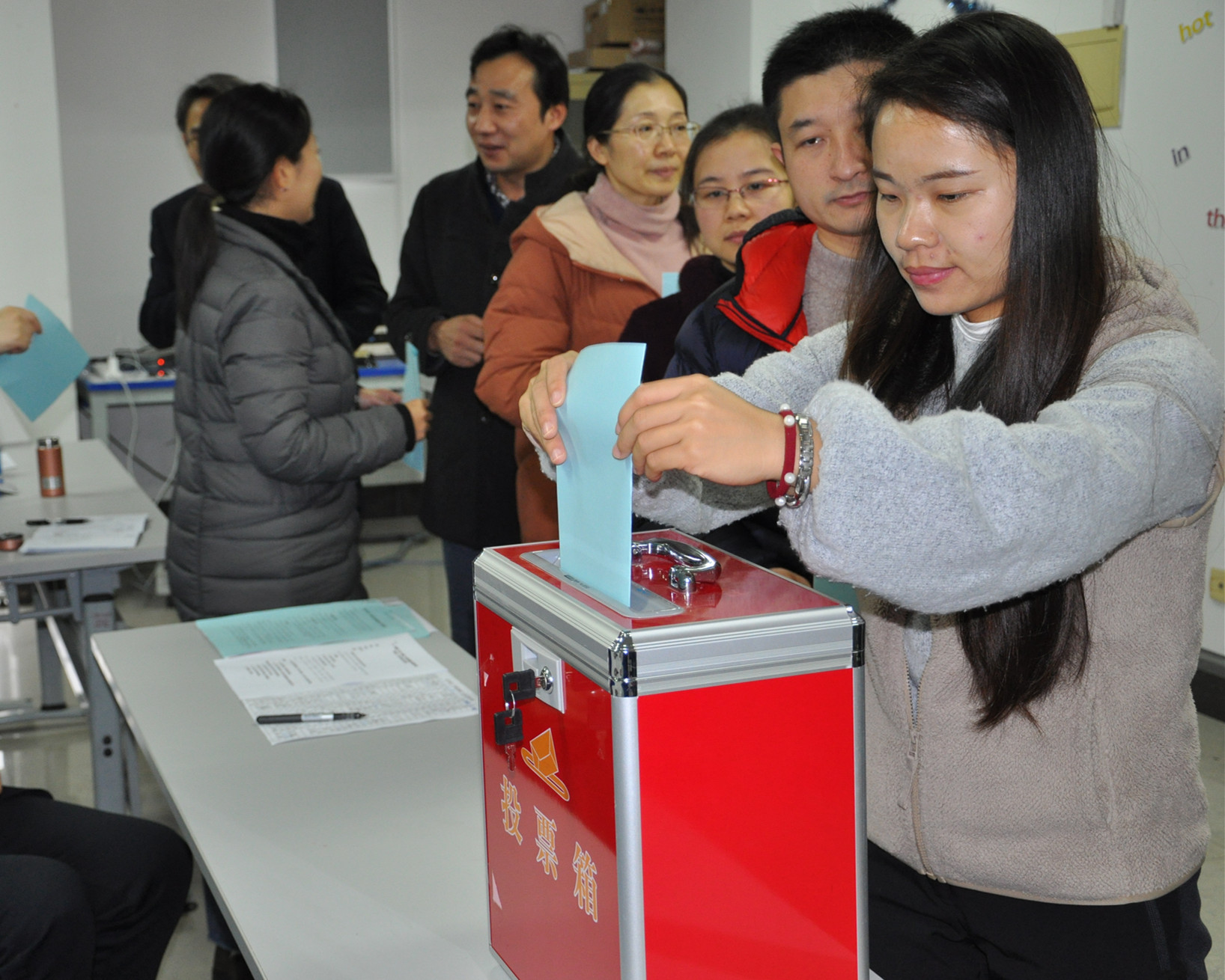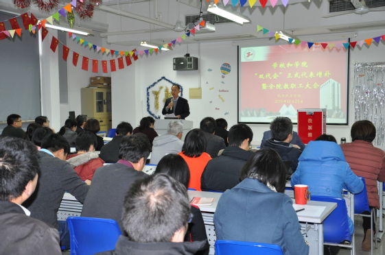 2019年12月25日中午,太阳成集团tyc151cc教职工大会选举增补公司第六届二次“双代会”、院双代会正式代表大会暨全院大会在实训楼4405顺利召开,全体教职工出席此次会议。本次大会第一阶段由秦颖副书记主持。会上,秦颖副书记首先向全体教职工传达了公司有关“双代会”文件精神,随后大会表决通过了大会选举办法及监票人、计票人名单。大会采用无记名投票、差额选举的方式进行有条不紊的选举。最终选举产生4名集团第六届二次“双代会”代表和8名公司双代会代表。