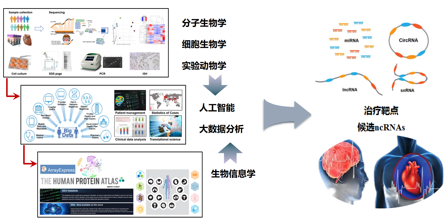 将生物信息技术、人工智能大数据及生物学技术相结合,深入解析心血管系统疾病的分子网络机制,发现新型干预靶点,突破心血管疾病的药物研发瓶颈,有利于提高心脑血管系统疾病的整体防治水平。团队系列研究表明微小核苷酸(miRNA)对心脏结构重构以及电重构过程具有重要调控作用。包括miR-26a、miR-101,miR-1,miR 328,let-7d等micro RNA在小鼠房颤、传导阻滞、心肌纤维化、心肌肥厚等病理过程中的作用,证明了micro RNA 可能作为心脏疾病治疗的候选RNA分子。近期研究发现长链非编码RNA对压力应激引起的心肌肥厚具有重要调控作用。包括LncRNA KCND1、Ak084656、Gm20257在小鼠心肌肥厚的病理过程中发挥重要作用,揭示了其作用机制和下游靶点,揭示了其作用机制和下游靶点,为药物作用机制研究开辟新的思路、新的药物作用靶点的发现。