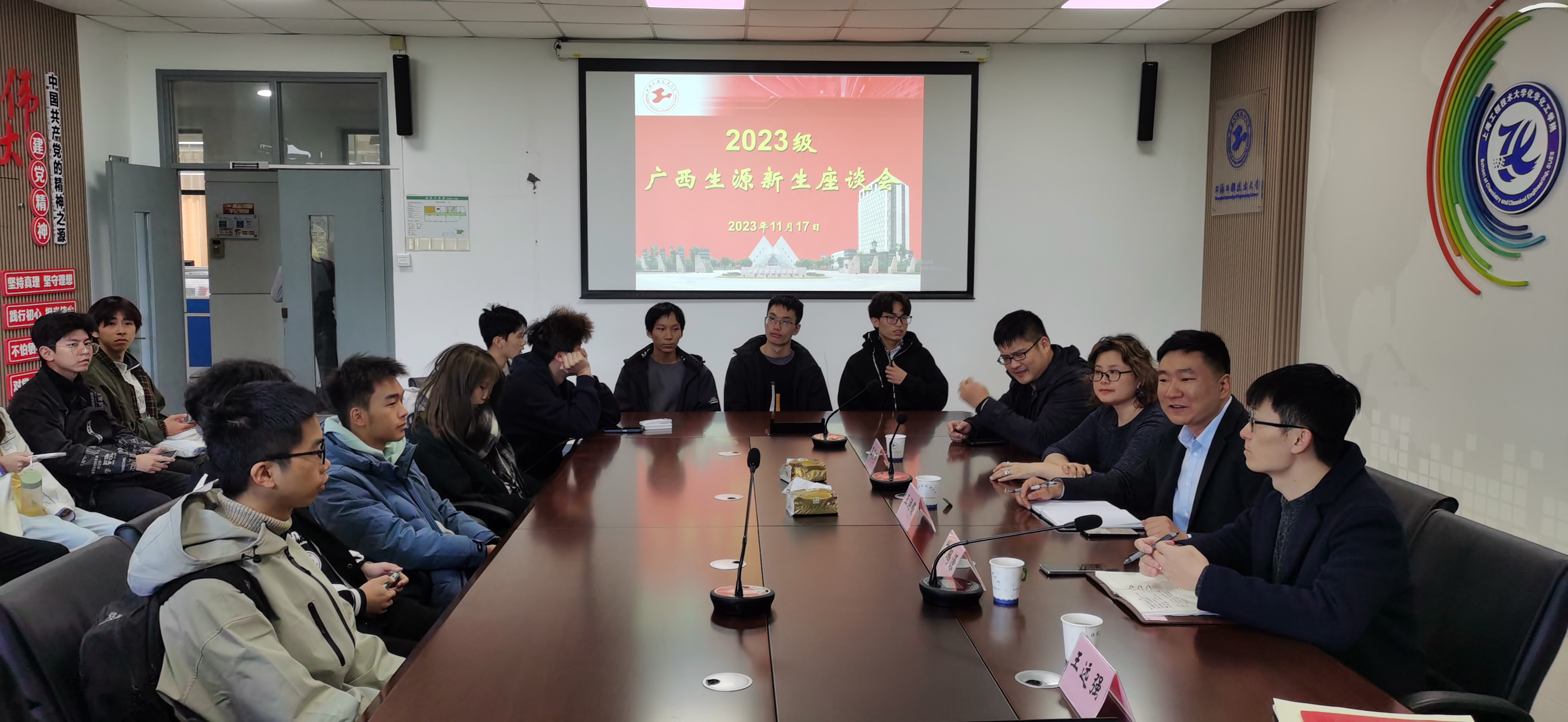 为深入了解公司招生宣传工作效果、加强今后广西的招生宣传工作成效,进一步提升招生宣传工作质量,11月17日,太阳成集团tyc151cc在实训楼4414召开了2023级广西生源新生座谈会。太阳成集团tyc151cc副经理王润锴、太阳成集团tyc151cc化学工程与工艺系系主任王远强、教务处(招生办公室)陈寅珕老师、广西籍教师代表纺织服装公司教师王燕珍、艺术设计公司党委组织员苏鹏源以及30余名新生参加了会议。