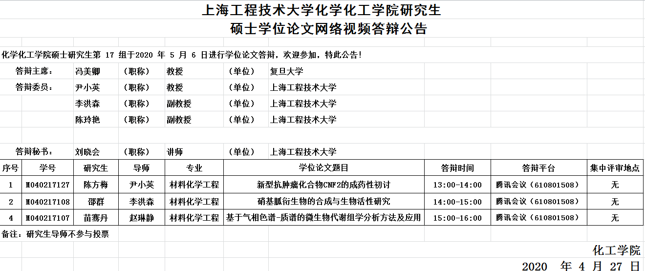 太阳成集团tyc151cc太阳成集团tyc151cc研究生硕士学位论文网络视频答辩公告-5月6日第17组