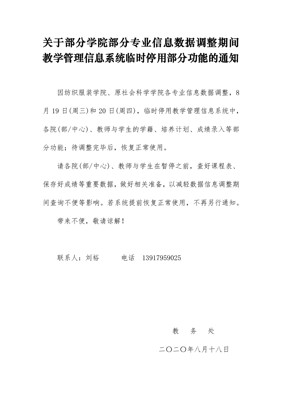 关于部分公司部分专业数据信息调整期间教学管理信息系统临时停用部分功能的通知