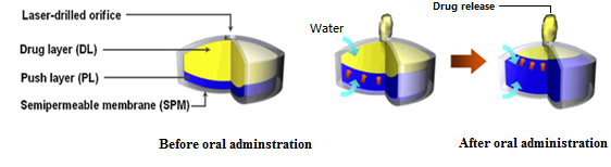 图1 渗透泵控释片的结构及释放机理